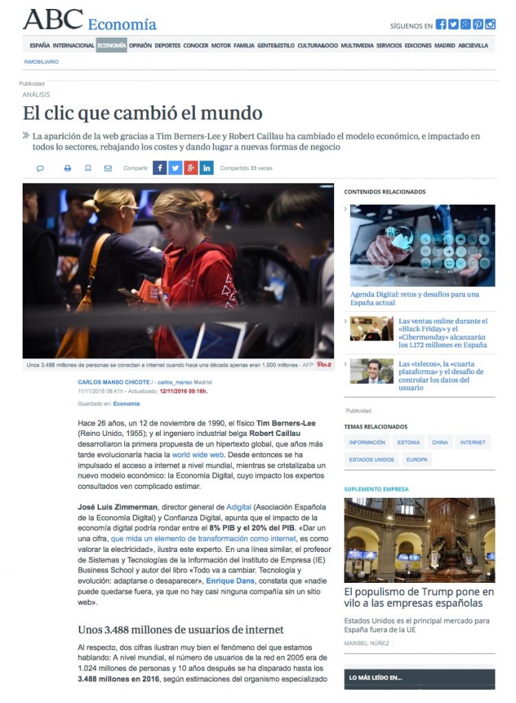 Carlos Manso, de ABC, me llamó para hablar del aniversario del día, 12 de noviembre de 1990, en que Tim Berners-Lee y Robert Caillau desarrollaron la primera propuesta de un hipertexto global, que años más tarde evolucionaría hacia lo que conocemos como la World Wide Web, y ayer publicó su artículo titulado «El clic que cambió el mundo» (pdf), en el que cita algunos de mis comentarios.