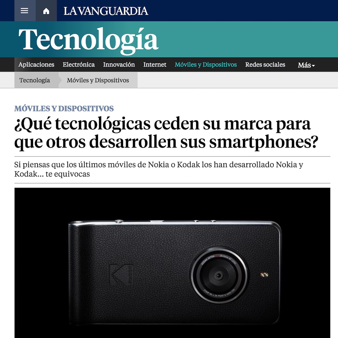 Carlos Otto me escribió para documentar un artículo en La Vanguardia sobre las compañías que ceden su marca para smartphones y otros productos de electrónica de consumo desarrollados íntegramente por terceros, como recientemente han hecho Kodak, Nokia o como anuncia que hará BlackBerry. Si artículo se publicó el pasado domingo bajo el título «¿Qué tecnológicas ceden su marca para que otros desarrollen sus smartphones?»