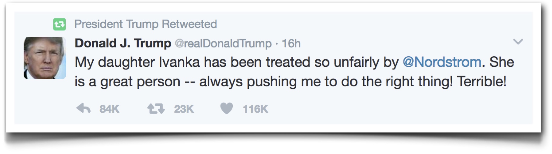 Pero el problema del tweet que aparece sobre estas líneas no es que Donald J. Trump, padre de Ivanka Trump, proteste por el tratamiento de Nordstrom a su hija. El problema está una línea más arriba, cuando el propio Donald J. Trump decide utilizar su cuenta oficial como presidente de los Estados Unidos, @POTUS, específicamente propiedad del cargo y no suya personal, para retwittear su protesta. Al hacerlo, está poniendo el peso de su cargo en contra de una cadena de grandes almacenes, está reprochando una decisión comercial a una compañía desde la mismísima jefatura del estado. El problema no es que su hija Ivanka sea tratada justa o injustamente (Nordstrom elimina de manera habitual aquellas marcas que no generan las ventas esperadas), que sea una gran persona o que impulse a su padre a hacer las cosas bien, como dice el texto del tweet… todo eso es completamente irrelevante. El problema es que no se puede de ninguna manera utilizar un recurso del estado para una reclamación de carácter personal o empresarial. No se puede. Va contra las más elementales reglas de la ética.