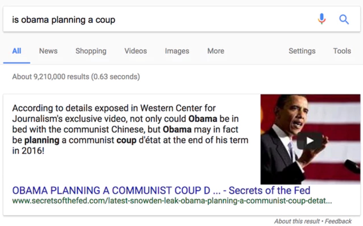 En el caso de Google, el problema fundamental parece partir precisamente de la no aplicación de ningún tipo de inteligencia: los snippets que el buscador destaca en respuesta a ciertas búsquedas parecen provenir directamente de algún tipo de ranking de popularidad, y en consecuencia, tender a destacar precisamente sitios de carácter sensacionalista o intensamente polarizado. Los ejemplos no dejan lugar a dudas: que el buscador destaque de manera prominente teorías conspiranoicas ante búsquedas como «planea Obama un golpe de estado», o destaque respuestas planteadas como broma por Monty Python como si fueran una verdadera explicación de por qué razón los coches de bomberos son rojos es algo que deja a la compañía en muy mal lugar, sobre todo después de que su director general, Sundar Pichai, destacase en repetidas ocasiones que «su inteligencia artificial estaba por encima de la inteligencia artificial de sus competidores«.