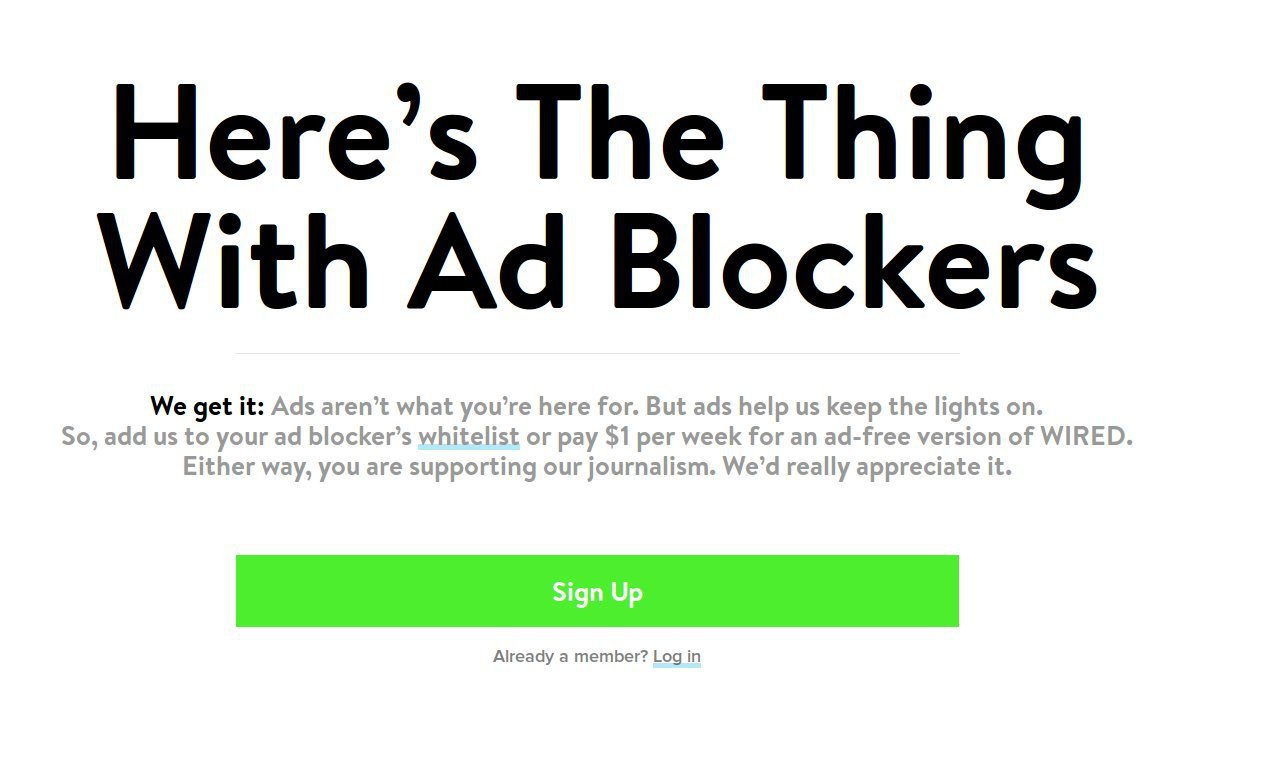 A partir de ahí, las publicaciones se centraron en detectar la presencia de un ad-blocker: si este se encontraba presente, la publicación pasaba, a su vez, a presentar una pantalla de bloqueo, que impedía al usuario acceder a su contenido y le conminaba a desconectar su bloqueador (en esta fase se encuentran en la actualidad muchas publicaciones españolas y redes de diarios regionales, que tienden a encontrarse con que, cuando el usuario es confrontado con esta pantalla, simplemente se da la vuelta y busca leer las noticias en otro sitio.