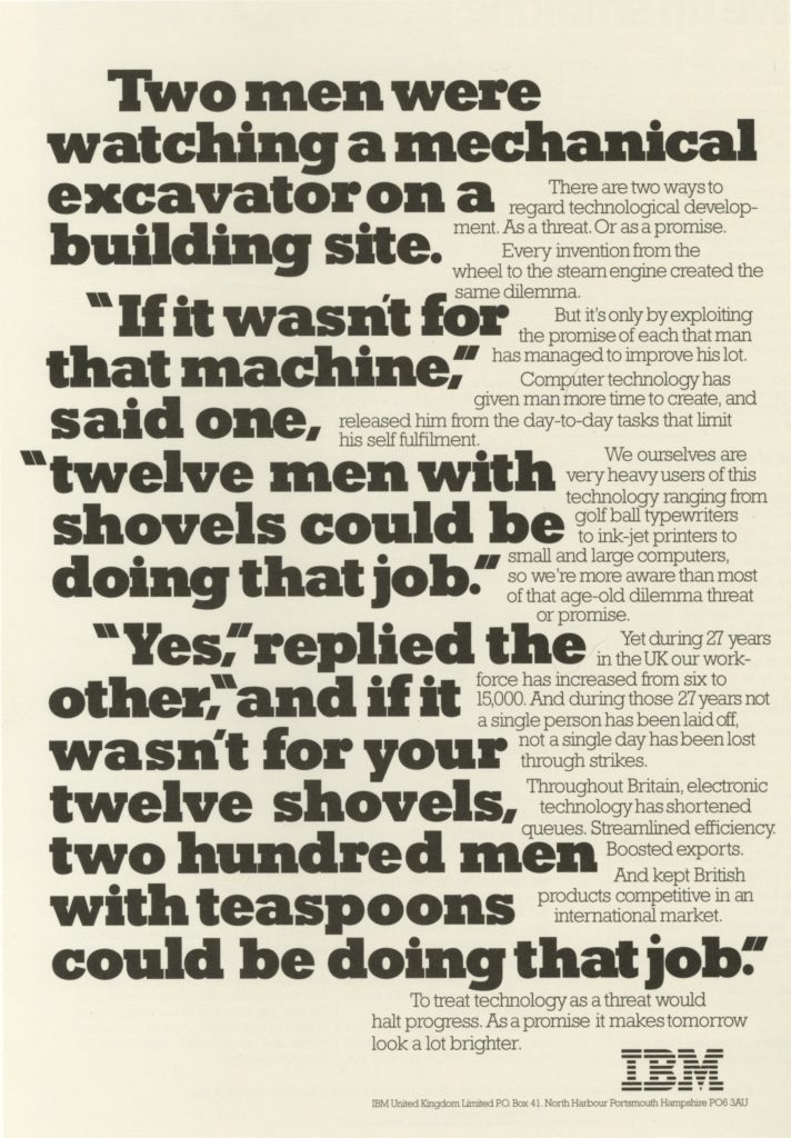 El pasado día 15, un tweet me recordó este anuncio de IBM que aparece en la ilustración, creado por Saatchi & Saatchi a principios de los años ’80: dos personas viendo trabajar una excavadora, el primero lamentándose por las doce personas con palas que podrían estar trabajando ahí, y el segundo recordándole que si se trata de dar trabajo a más personas, ese mismo trabajo podrían hacerlo doscientas personas equipadas con cucharillas de té.