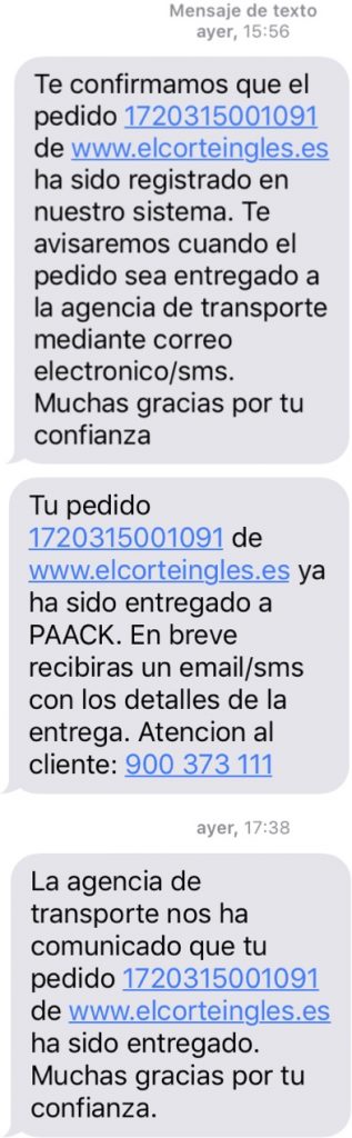 La secuencia de SMS capturada en la ilustración muestra el resultado: pedido hecho a las 15:56, y recibido en casa a las 17:38. Menos de dos horas. Sin incidencias ni problemas de ningún tipo.
