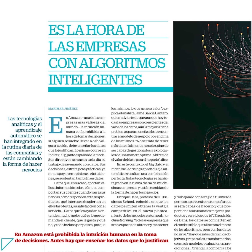 Marimar Jiménez, de Cinco Días, me envió algunas preguntas por correo electrónico para documentar un artículo sobre las ventajas competitivas que puede suponer el machine learning para las compañías, artículo que publicó ayer viernes bajo el título «Es la hora de las empresas con algoritmos inteligentes» (pdf).
