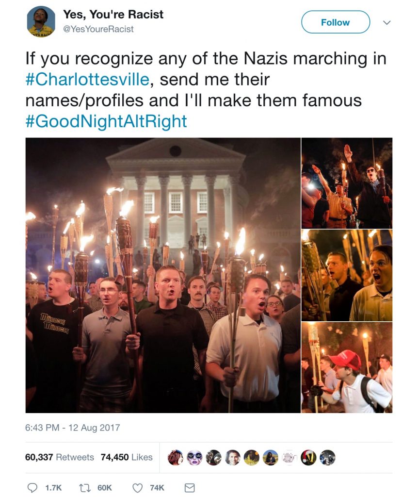 A partir de las fotos divulgadas por los medios de la manifestación original, en la que una serie de individuos aparecían marchando en actitudes agresivas con antorchas y saludos nazis, una cuenta de Twitter con más de un cuarto de millón de seguidores, @YesYoureRacist, solicitó a quienes pudiese reconocer a alguien en esas fotografías que le enviasen sus nombres o perfiles sociales para revelar públicamente sus identidades. El tweet original, reproducido en la imagen, cuenta a estas alturas con más de sesenta mil retweets, y ha provocado ya que al menos una persona haya perdido su trabajo y otro se exponga a ser expulsado de la universidad en la que estudia.