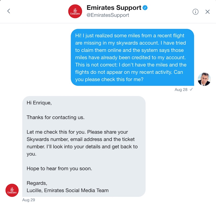 Un pequeño intercambio de mensajes directos a través de Twitter con el servicio al cliente de Emirates me lleva a darme cuenta de que lo que hace no mucho tiempo considerábamos excepcional, ser capaces de dirigirnos al servicio al cliente de una compañía a través de la red social que escojamos y ser atendidos de manera rápida y competente, se ha convertido en el nuevo estándar para un número cada vez mayor de compañías.
