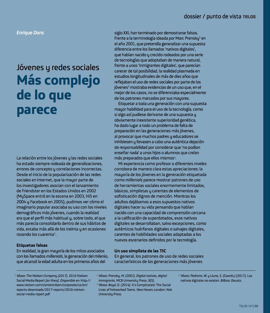 En el número 107 de la revista Telos, editada por la Fundación Telefonica y disponible en abierto en su página web tanto en formato texto como en pdf, me publican un artículo titulado «Jóvenes y redes sociales: más complejo de lo que parece» (pdf), como parte de un dossier central titulado «Jóvenes y redes sociales».