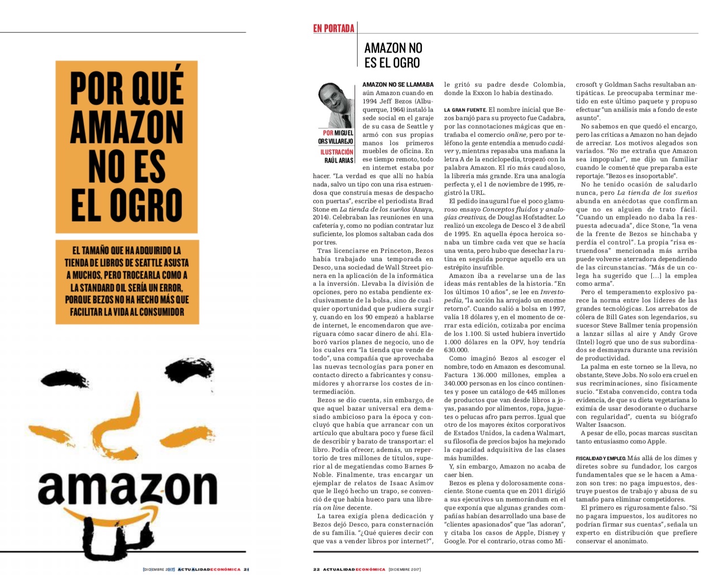 Miguel Ors Villarejo, de Actualidad económica, me llamó para hablar sobre Amazon, y este mes ha publicado un artículo en la revista titulado «Por qué Amazon no es el ogro» (pdf) en el que comenta algunos de los temas de los que hablamos, en lo que fue una conversación telefónica larga y la mar de agradable.