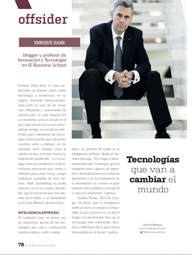 David Ramos me llamó para hacerme una entrevista telefónica larga sobre el impacto de la tecnología en la industria aseguradora, y ayer me envió el resultado, una página doble publicada bajo el título «Tecnologías que van a cambiar el mundo» (pdf) en la revista Actualidad Aseguradora.