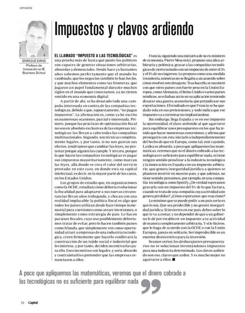 Jordi Benitez, director de la revista Capital, me pidió un artículo acerca del llamado «impuesto a las tecnológicas», una idea absurda en cuya defensa Francia se ha quedado completamente sola en Europa y que es posible que ni ella misma ponga en práctica, pero en la que el gobierno anterior quiso ver un clavo ardiendo al que agarrarse para «sacar un dinerito con el que intentar tapar algunos agujeros».