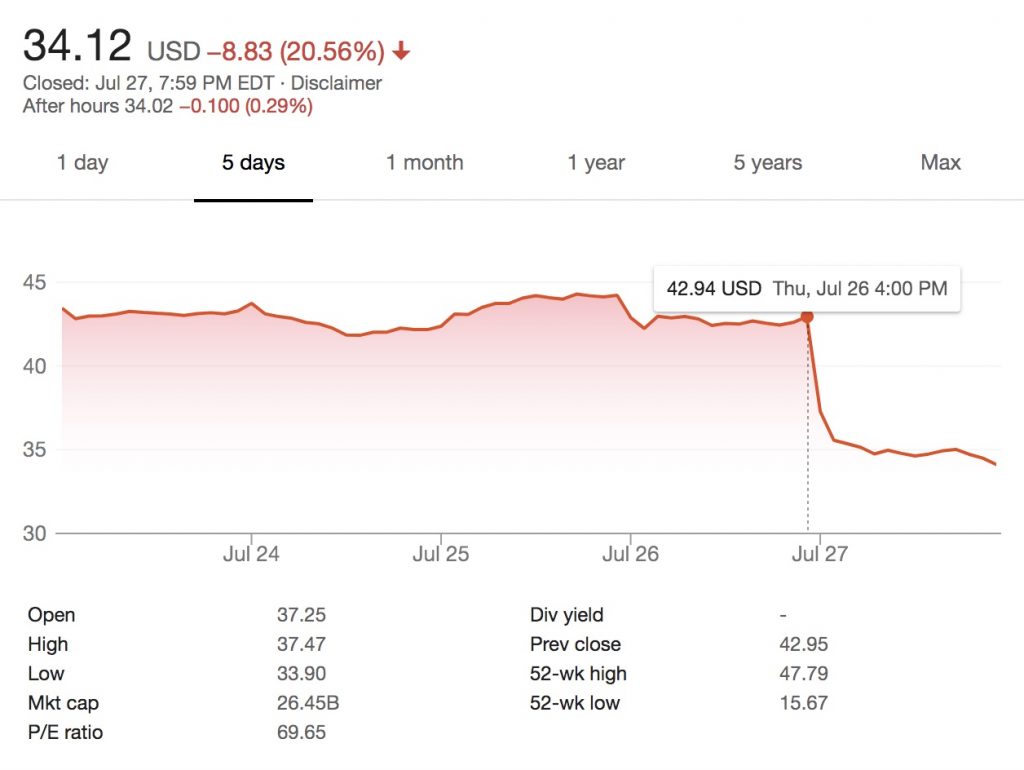 La compañía publicó unos resultados en los que mostraba un beneficio récord por tercer trimestre consecutivo, concretamente 134 millones de dólares equivalentes a 13 centavos por acción, 17 centavos por acción tras ajustes, frente a una estimación consensuada por los analistas de 16 centavos. Los ingresos de Twitter subieron un 24% hasta los 710.5 millones de dólares, dos millones de dólares por encima de las estimaciones. Hasta aquí, todo habría indicado un buen trimestre. Sin embargo, la compañía presentó una caída de un millón de usuarios hasta los 355 millones debido a la fuerte limpieza de perfiles falsos, bots y trolls que la compañía está llevando a cabo, que fue valorada por los analistas como una supuesta indicación de ralentización del crecimiento, y fuertemente penalizada.