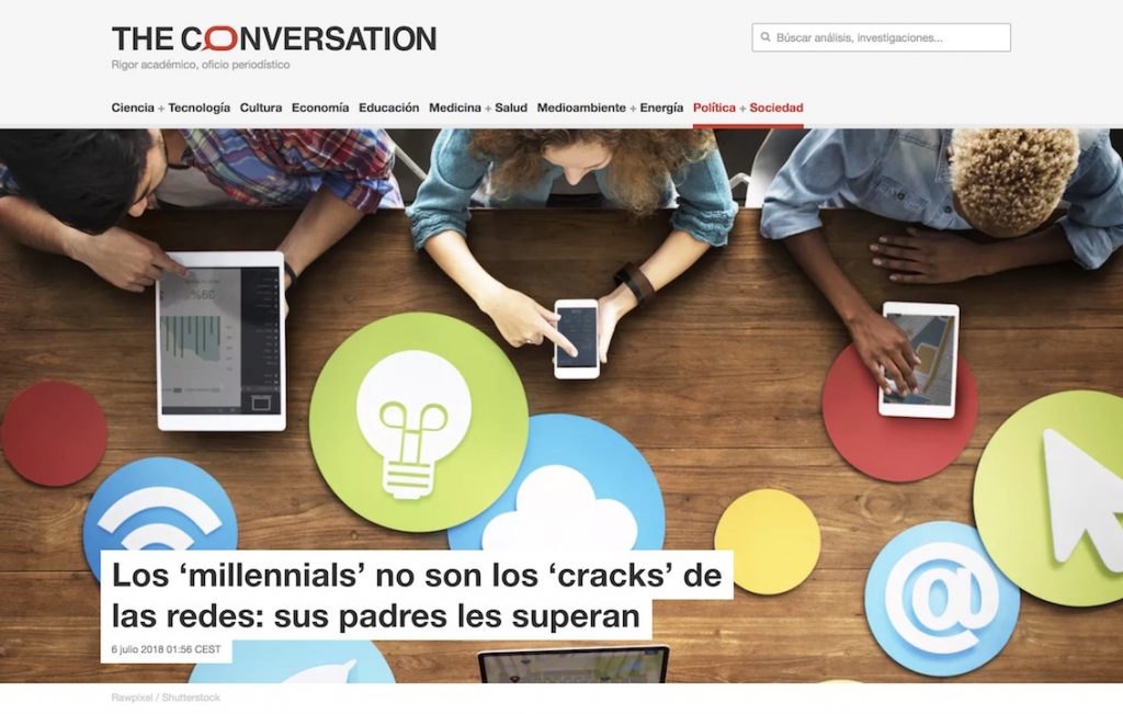 La recientemente inaugurada versión española de la conocida página The Conversation me pidió permiso para publicar una versión abreviada y menos académica de un artículo mío anteriormente publicado en Telos, que han titulado como «Los ‘millennials’ no son los ‘cracks’ de las redes: sus padres les superan«.