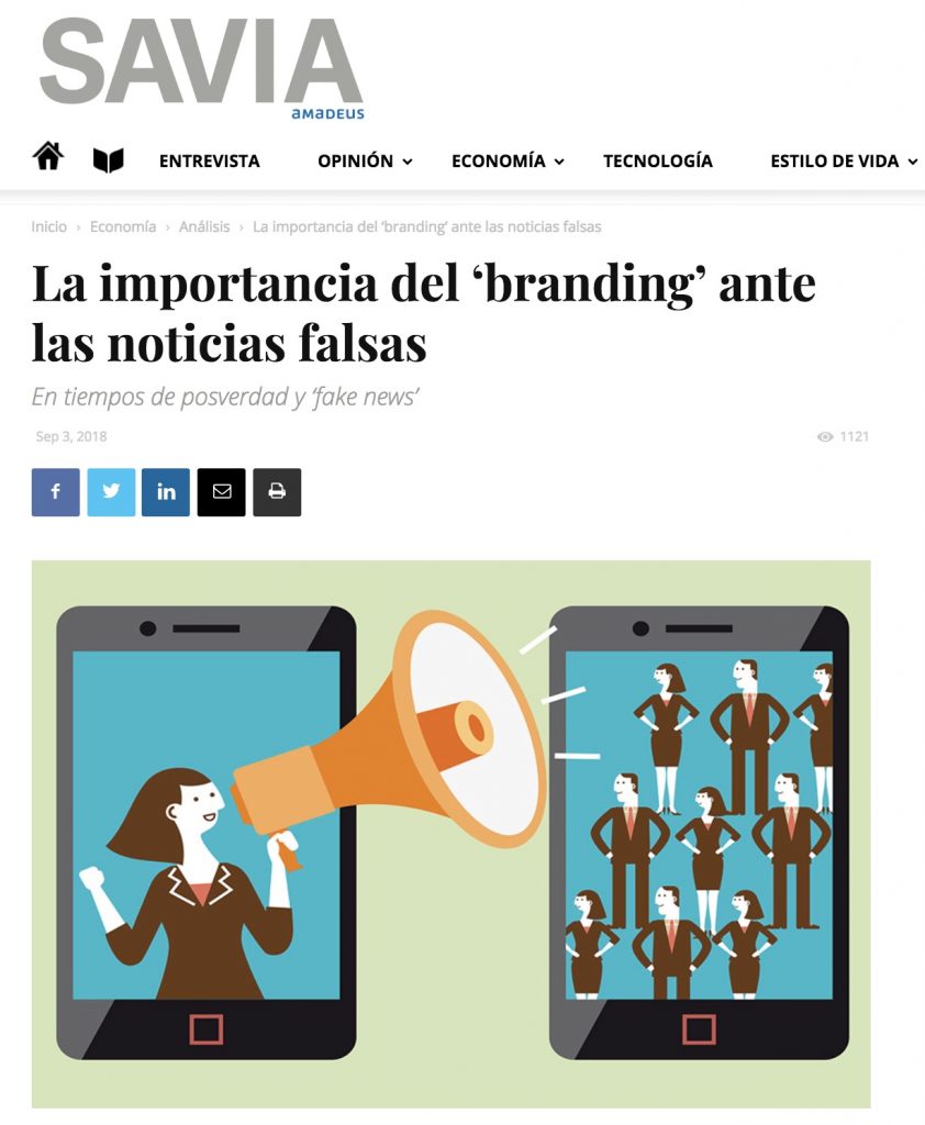 Maribel Fernández me contactó por correo electrónico para documentar un artículo en el que estaba trabajando para Savia, publicada por Amadeus, sobre el impacto de las llamadas fake news en la comunicación corporativa y la importancia de contar con un buen branding o política de marca a la hora de contrarrestar su influencia. Su artículo está incluido en el número de septiembre de la revista, bajo el título «La importancia del ‘branding’ ante las noticias falsas» (pdf).
