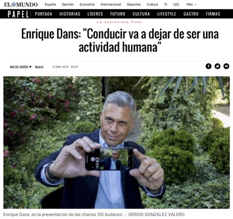Ayer se publicó en el suplemento Papel, del diario El Mundo, una entrevista que hice el pasado abril y de la que ya casi ni me acordaba, con motivo de la invitación que me hizo la marca francesa de automoción DS. Una invitación hecha bajo el tema de la audacia, que para mí tuvieron la audacia de mantener cuando contesté a su primer contacto diciéndoles que mi interés en un vehículo no eléctrico era entre escaso y nulo, y que creía firmemente que cuanto antes tuviese lugar el fin de la fabricación de vehículos con motor de explosión, mejor para todos y para el planeta. La entrevista se publicó ayer bajo el título «Enrique Dans: ‘conducir va a dejar de ser una actividad humana’«.