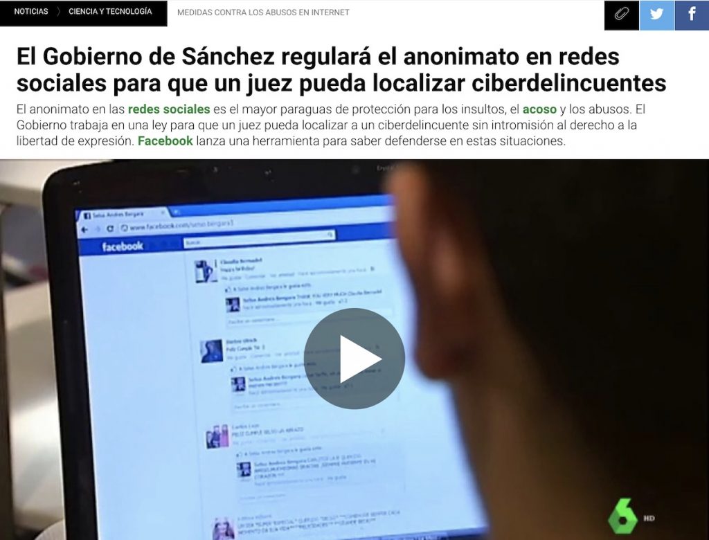 Coincidí con Mario Toledo, de La Sexta Noticias, en la inauguración de Zona Facebook, y me envió posteriormente un correo electrónico para pedir mi opinión sobre un tema que la Secretaria de Estado de Igualdad, Soledad Murillo, comentó en ese mismo evento: la idea de que el anonimato es algo que hay que denunciar y perseguir, o una cuestión de cobardía. Con esos elementos, Mario montó una pieza que ha titulado «El Gobierno de Sánchez regulará el anonimato en redes sociales para que un juez pueda localizar ciberdelincuentes» (pdf), que fue emitida ayer domingo.