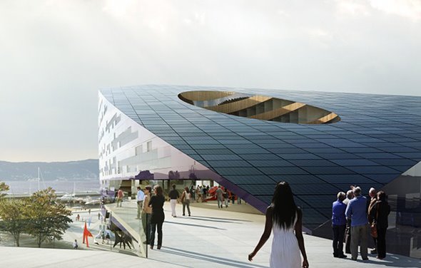 A mi los números no me salen demasiado para este edificio, que por las bonitas y limpísimas fotos tiene pinta de no existir todavía. Esos aparentemente magníficos 485.000 megavatios solo te dan para abastecer la ridícula cifra de 25 hogares noruegos medios (un bloque normalito de pisos, vamos), y eso de que la mayoría de la energía generada sería sobrante tampoco me cuadra mucho, el consumo de un edificio de oficinas de 8 plantas en Noruega ha de ser bastante alto (muchísimo mayor que el de esos 25 hogares noruegos medios que dicen alimentar), aunque en aire acondicionado gasten poco. La pregunta a responder es si esto es remotamente rentable.