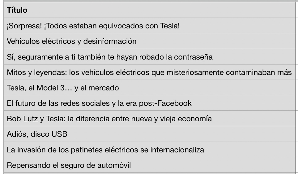No es ese el resultado que tienes que mirar. Para decidir eso tendrías que ver cuántas de las entradas que he escrito son sobre ese tema, no cuántas hay en mi top ten. Mi top ten no refleja – necesariamente – mis intereses, sino los de mis lectores. Pero en cualquier caso, los vehículos eléctricos son definitivamente tecnología, y como digo en la entrada, las industrias que sufren procesos disruptivos son definitivamente algo que me ha interesado siempre. Cuando hace años escribía muchísimo sobre música y descargas no era porque me interesase especialmente esa industria – aunque terminase dando conferencias a varias de las grandes discográficas – sino porque me interesaba la disrupción.