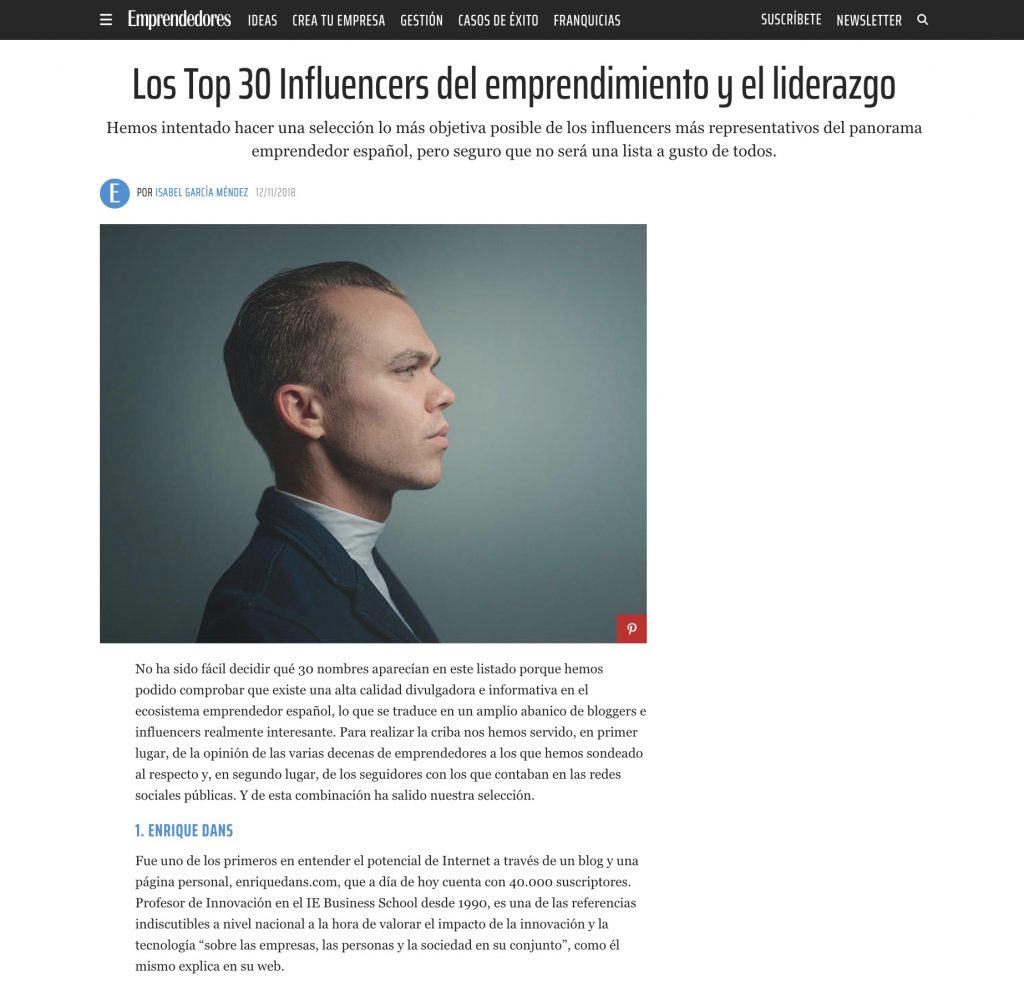 La revista Emprendedores publicó un ranking de influencers del emprendimiento y liderazgo (pdf), y tuvo a bien incluirme en él. Lo publicó en la red, según veo, en noviembre del año pasado, aunque parece ser que acaba de salir en la edición papel en la revista, y eso ha hecho que se comente en algunos sitios.