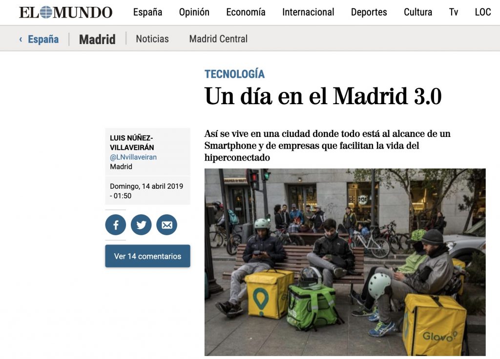 Luis N. Villaveiran, de El Mundo, me llamó por teléfono hace unos días para hablar sobre los cambios de hábitos y el impacto del desarrollo tecnológico en la vida en una ciudad como Madrid, y ayer domingo publicó un artículo titulado «Un día en el Madrid 3.0» (pdf) en el que me cita.
