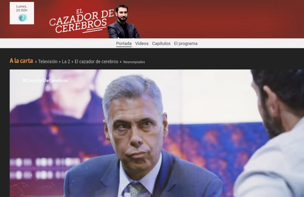 Me llamó la atención encontrarme en Twitter con algunas citas mías y algunas imágenes de un programa de televisión emitido en La 2 de Televisión Española, «El cazador de cerebros», de Pere Estupinyà, titulado «Neuroespiados«, y que reproduce parte de una entrevista que hicimos en la WoW Room de IE University… ¡en junio de 2017, hace dos años!!