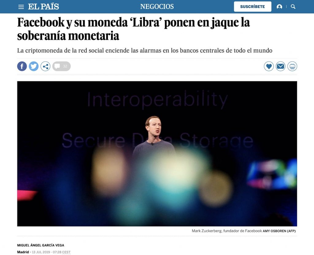 Miguel Ángel García Vega, de El País, me escribió para pedirme opinión sobre el anuncio del próximo lanzamiento de Libra por parte de Facebook, y hoy publica un artículo en el que me cita brevemente e incluye también declaraciones de otros analistas que ven problemas en su planteamiento, titulado «Facebook y su moneda ‘Libra’ ponen en jaque la soberanía monetaria» (pdf).