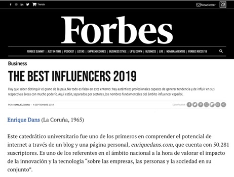En cualquier caso, agradecido a Forbes España por la mención, y la promesa de seguir haciendo básicamente lo mismo que llevo haciendo ya mucho tiempo preparar mis clases de la manera más rigurosa que pueda, leer mucho para mantener mi criterio bien informado, y escribir sobre ello para contribuir a la reflexión. Si eso me convierte en influencer, bienvenido sea.