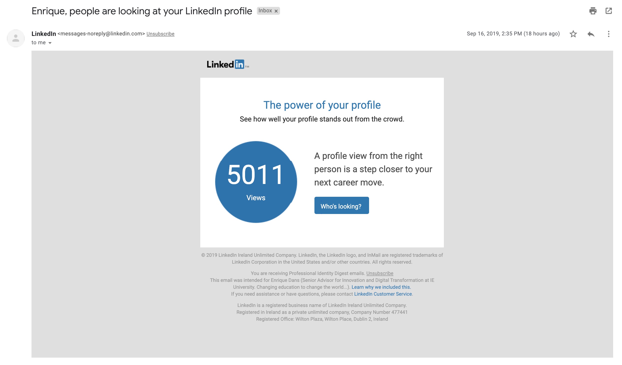 Mi inclusión en un ranking de influencers en la edición española de la revista Forbes parece haber llevado a que aparezcan en mi bandeja de entrada varias propuestas de compañías con múltiples «esquemas de colaboración», un eufemismo que viene a significar «te pagamos para que uses tu influencia para decir que nuestra marca es la mejor». Lamentándolo profundamente – por mi cuenta corriente, no por otra cosa – creo que es mi deber comunicar públicamente que no es eso a lo que me dedico. Dice un buen amigo mío que «las listas hay que tomarlas con un grano de sal, tanto cuando sales como cuando no». Pero entre la lista de LinkedIn de hace unas semanas y esta de Forbes España, las visualizaciones de mi perfil de LinkedIn alcanzan cifras «extrañas«, y es bueno intentar poner las cosas en perspectiva.