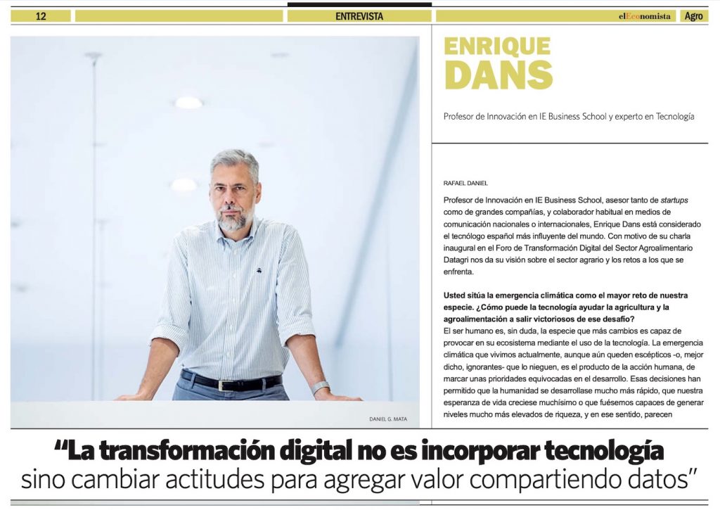 Rafael Daniel, director de elEconomistaAgro, me entrevistó por correo electrónico para el suplemento con motivo de mi próxima participación en el Foro de Transformación Digital del Sector Agroalimentario, Datagri, y la publicó ayer bajo el título «La transformación digital no es incorporar tecnología