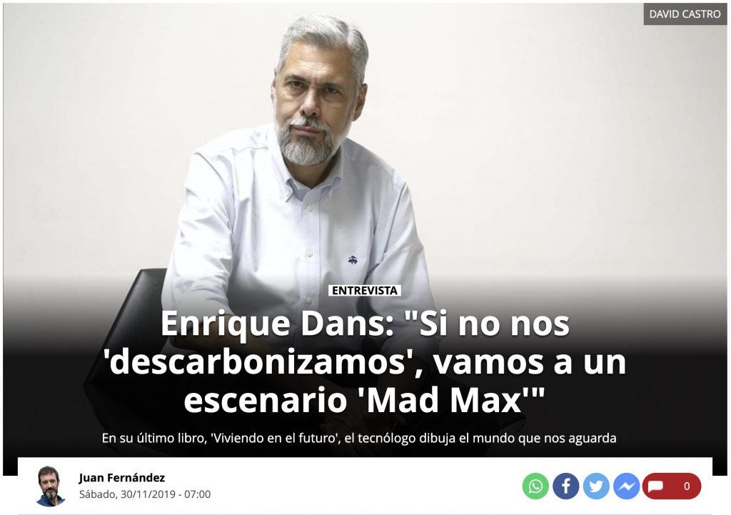 Juan Fernández me entrevistó para El Periódico, con fotografía del multipremiado David Castro, hablando sobre mi libro «Viviendo en el futuro«, y lo publica hoy en su edición online, bajo el título «Si no nos descarbonizamos vamos a un escenario ‘Mad Max’» (pdf). Mañana estará disponible en papel (pdf).