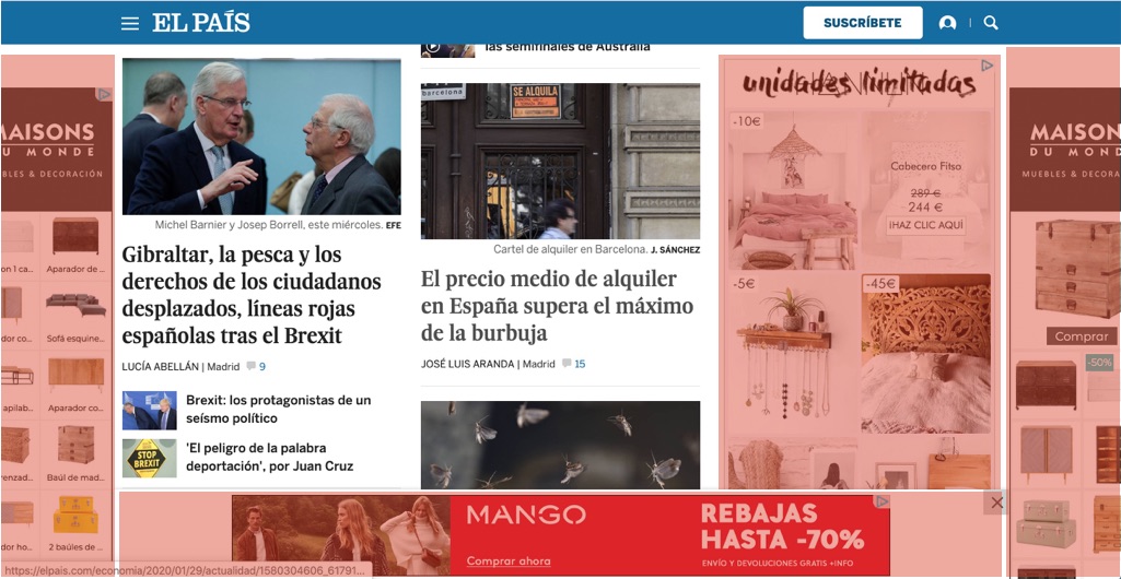 Un ratio 60/40. ¿Qué lleva a lo que se supone que es un diario de referencia a ocupar el 60% de la superficie de su página con un contenido que los lectores no han solicitado y, además, no quieren ver? Tus usuarios entran en tu página para informarse leyendo las noticias que produce tu redacción, los periodistas que aportan al medio su prestigio y su influencia, pero tú te dedicas a castigarlos y a llenar nada menos que el 60% del espacio disponible de pantalla con algo que claramente les molesta, que no han pedido, que no quieren ver, y que les lleva a pensar que han aterrizado en cualquier página basura, en un panfleto cuya función es acomodar cuanta más publicidad sea posible. Visto así, cualquiera podría pensar que las noticias, en realidad, son simplemente eso, una simple excusa para poder llenar la mayoría del espacio de la página con publicidad. De alguna manera, alguien en El País ha pensado que un balance así podía ser algo normal, algo de alguna manera lógico o aceptable, que a los lectores no les iba a importar.