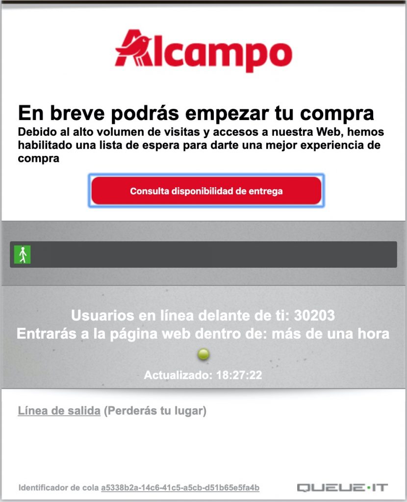 Responder a un pico de pedidos completamente inesperado, fruto de un evento tan difícil de prever como una pandemia es algo prácticamente imposible, como estarán comprobando los miles de personas que intentan, estos días, hacer la compra a través de la red. El fenómeno es el mismo que si miles de personas intentasen entrar en un supermercado al mismo tiempo: las ventanas de reparto se agotan rápidamente, se rompe el stock de muchos productos, y surge la necesidad de enviar pedidos incompletos o con sustituciones. ¿Alguien es capaz de imaginarse una cola de más de treinta mil personas intentando entrar en un supermercado?