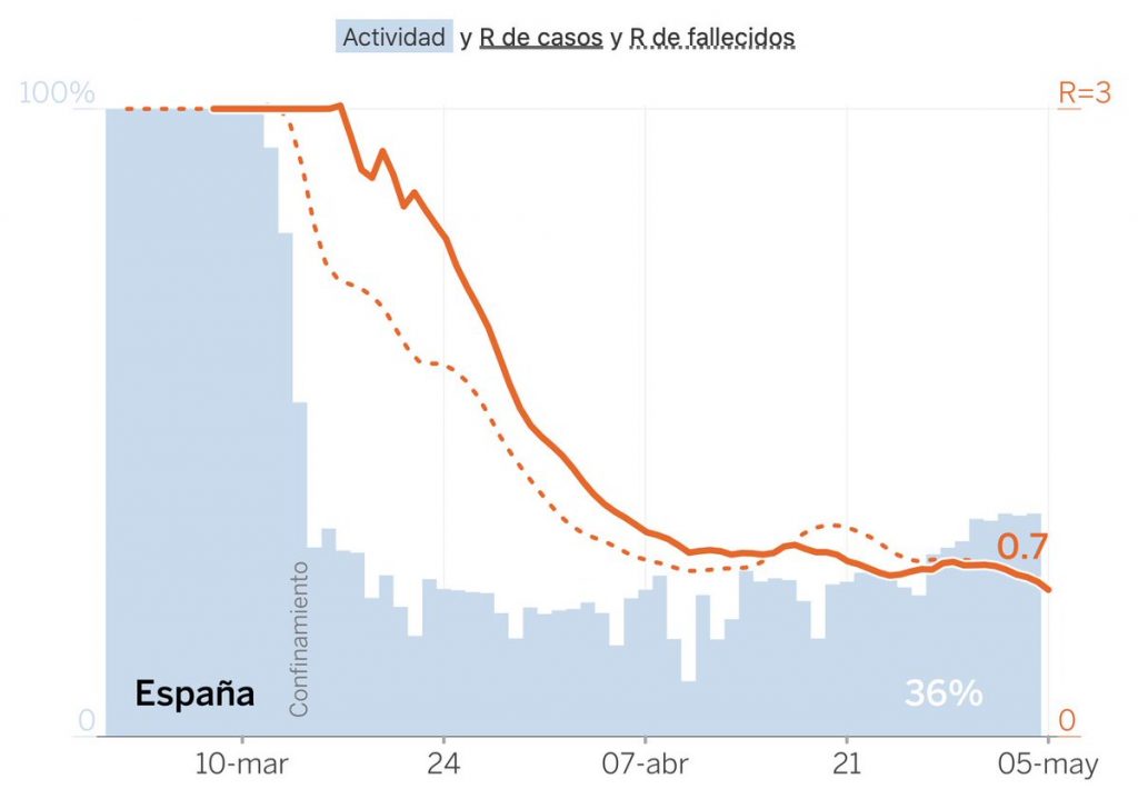 Ilustro con la gráfica que Kiko Llaneras compartió en Twitter, que muestra la evolución de la actividad en el país frente a la evolución de los contagios y los fallecimientos, y que me ha parecido especialmente clara: lo que pretendemos ahora es elevar la actividad, la serie en azul, mientras mantenemos descendente las series de color naranja. Para ello, las herramientas utilizadas en la mayoría de los países se han apoyado en la tecnología, particularmente en un fuerte incremento del número de tests diagnósticos (cuya enorme importancia comentamos a principios de marzo) y donde la gestión de nuestro país ha sido especialmente mala, y en aplicaciones de trazabilidad de contactos o, en su defecto, de los llamados «rastreadores«, que registran manualmente los contactos que las personas infectadas declaran haber tenido.