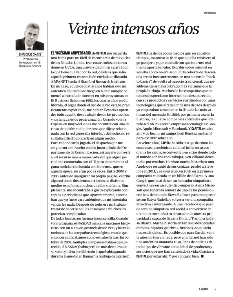Mi columna se titula «Veinte intensos años» (pdf), y trata de rememorar mis experiencias de esos veinte años, que para mí comenzaron con mi vuelta de Los Angeles tras los cuatro años que pasé allí cursando mi doctorado, el comienzo de mi relación habitual con los medios de comunicación, y cómo experimenté esos años: la crisis de las puntocom y los agoreros que afirmaban entonces que todo se había acabado, el crecimiento de las tecnológicas hasta convertirse en las más valiosas del mundo, las consecuencias de la ausencia de regulación y de la irresponsabilidad de algunos…