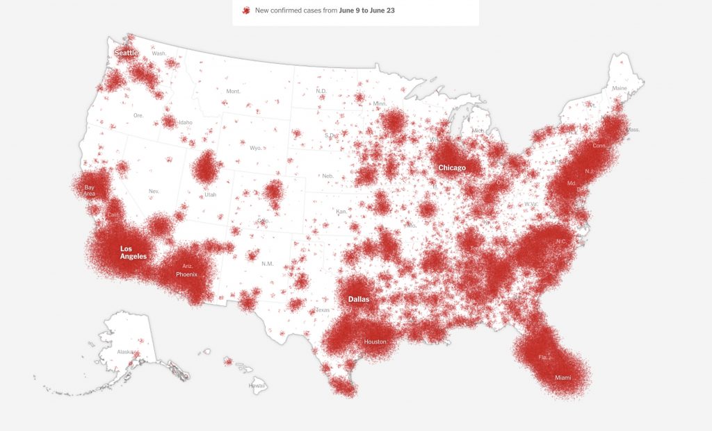 El caso de los Estados Unidos es especialmente grave: llevados por la grandilocuencia de un presidente que parece estar ya en la fase de «emperador loco» capaz de tocar la lira mientras su país arde, y por una campaña de muchos de sus seguidores y de bots que presionaban para la apertura y que en muchos casos se niegan a utilizar mascarilla, los Estados Unidos parecen haber decidido colectivamente ignorar la pandemia, algo que está dando alas al ritmo de la infección. Múltiples estados están evolucionando fuertemente al alza en el número de casos y de víctimas, otros están falseando las cifras de tests o de víctimas, o respondiendo de formas que llevan a la pandemia a evolucionar a peor. El mundo está empezando a poner a los Estados Unidos en cuarentena.