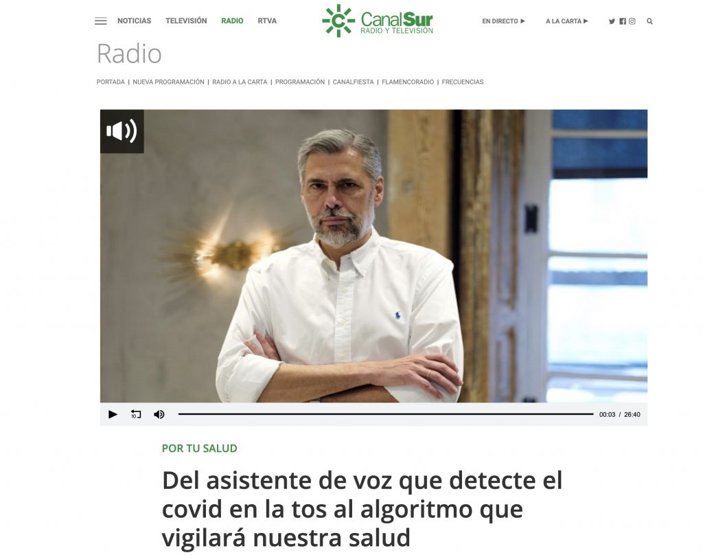 Enrique Jesús Moreno, de Canal Sur, me pidió una entrevista para su programa «Por tu salud», que ha titulado como «Del asistente de voz que detecte el covid en la tos al algoritmo que vigilará nuestra salud» (pdf).