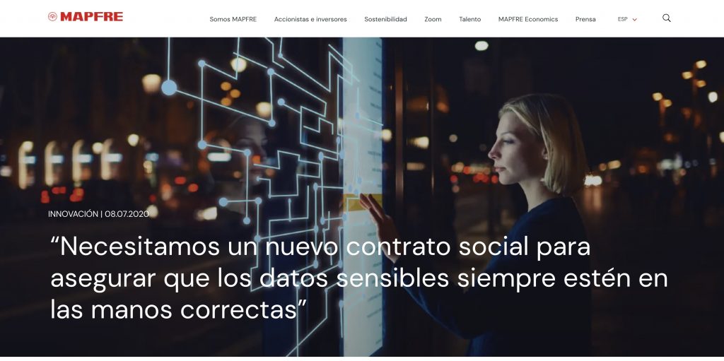 Marta Villalba me contactó por teléfono el pasado 8 de junio para hacerme una entrevista en la web internacional de MAPFRE, que han titulado como «Necesitamos un nuevo contrato social para asegurar que los datos sensibles siempre estén en las manos correctas» (pdf) y han traducido además al inglés, «We need a new social contract to ensure that sensitive data always stay in the right hands« (pdf), y al portugués, «Precisamos de um novo contrato social para garantir que os dados sensíveis sempre estejam nas mãos corretas« (pdf).