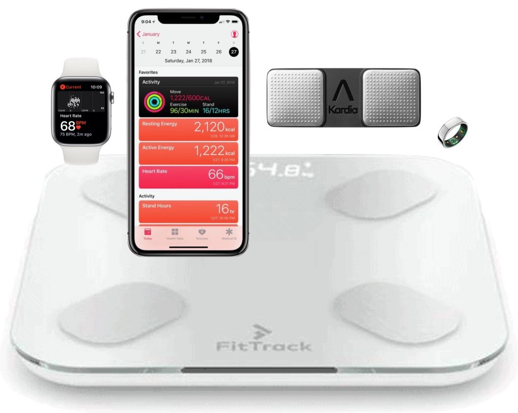 Los wearables son otro de los elementos importantes en esta agenda: en la imagen, mi setup actual, compuesto por el Apple Watch, la báscula FitTrack, el anillo Oura y el sensor cardíaco Kardia, todos ellos enlazados con el iPhone que recoge todas sus lecturas en Apple Health, pero obviamente, la cantidad de opciones y combinaciones es enorme, depende de muchos factores, y a partir de un nivel de calidad determinado, está únicamente condicionada por la compatibilidad entre dispositivos y el error estándar que genere cada uno de ellos. A partir de ahí, y con la incorporación de otros dispositivos para, por ejemplo, el control de la presión arterial, analíticas de orina, de glucemia, etc., otras analíticas más específicas o incluso de la información genética obtenida a través de pruebas sencillas se podrá obtener una imagen muy completa no solo de los antecedentes o el historial médico del paciente, sino también del panorama dinámico de la evolución de su salud.