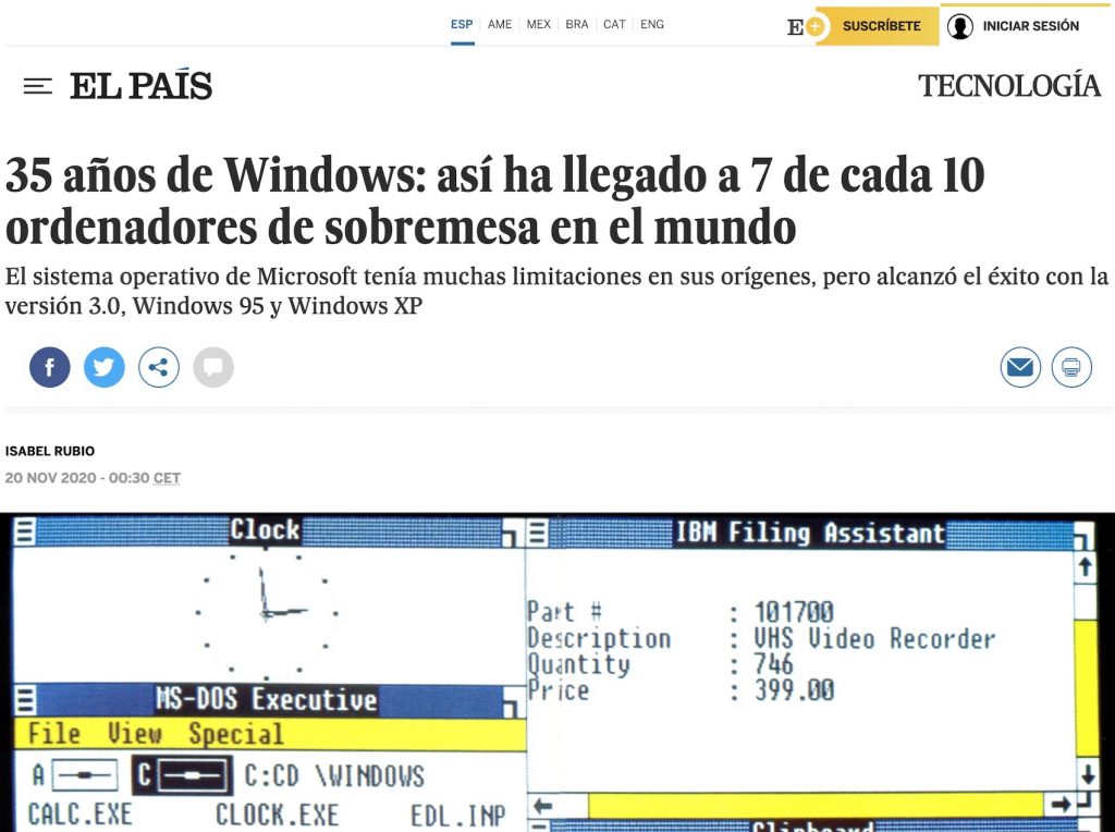 Isabel Rubio me envió algunas preguntas por correo electrónico para hablar sobre Windows, al hilo del 35 aniversario del lanzamiento de su primera versión, y ha citado algunos de mis comentarios en su reportaje titulado «35 años de Windows: así ha llegado a 7 de cada 10 ordenadores de sobremesa en el mundo» (pdf).