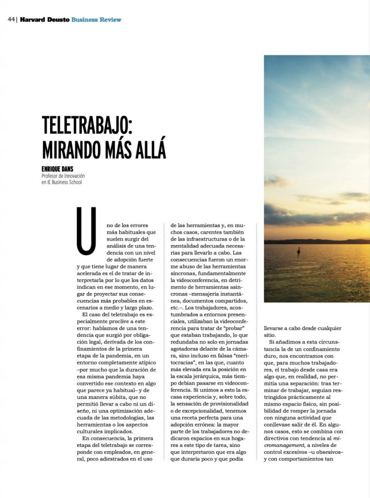 Desde Harvard Deusto Business Review me pidieron un artículo breve sobre el tema del teletrabajo, sobre el que he escrito bastantes cosas desde que comenzamos la pandemia.
