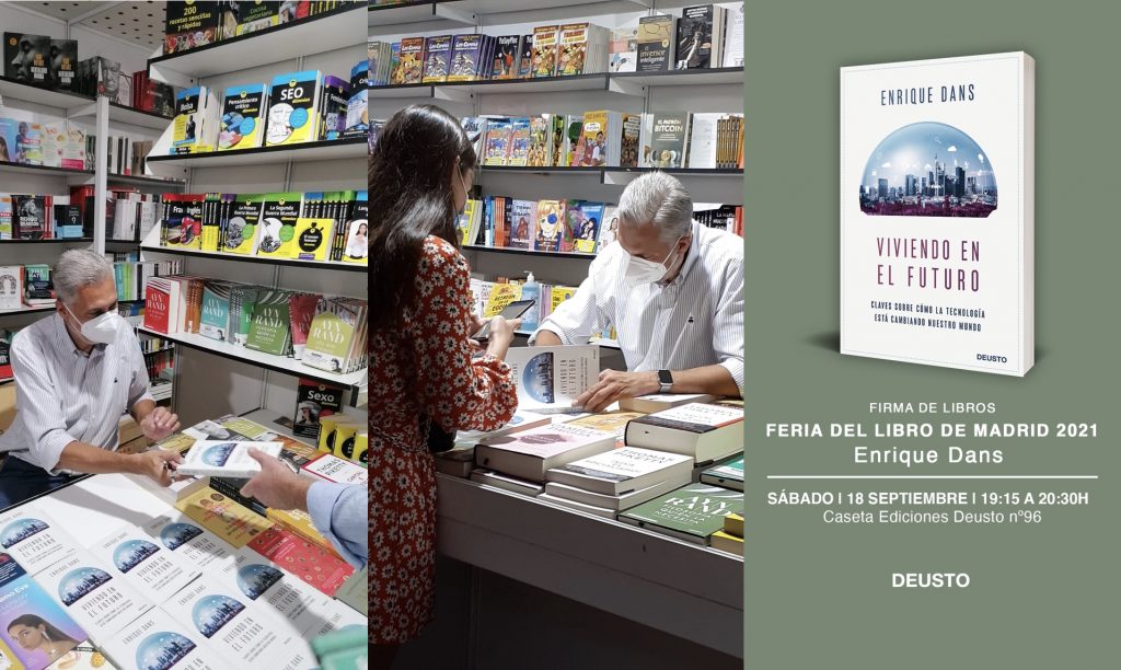Ayer estuve en la Feria del Libro de Madrid, firmando algunos ejemplares de mi libro, «Viviendo en el futuro«, en la caseta de Deusto, mi editorial. Una Feria un poco diferente a la de otros años, en primer lugar por la época del año (no se pudo celebrar en su habitual fecha de junio debido a las restricciones por la pandemia), lo que implica que pasamos algo menos de calor de lo habitual y que se hiciese de noche sensiblemente antes, y un sistema de control de aforo que provocó largas colas que en algunos momentos llegaron a ser de hasta hora y media para acceder al recinto.