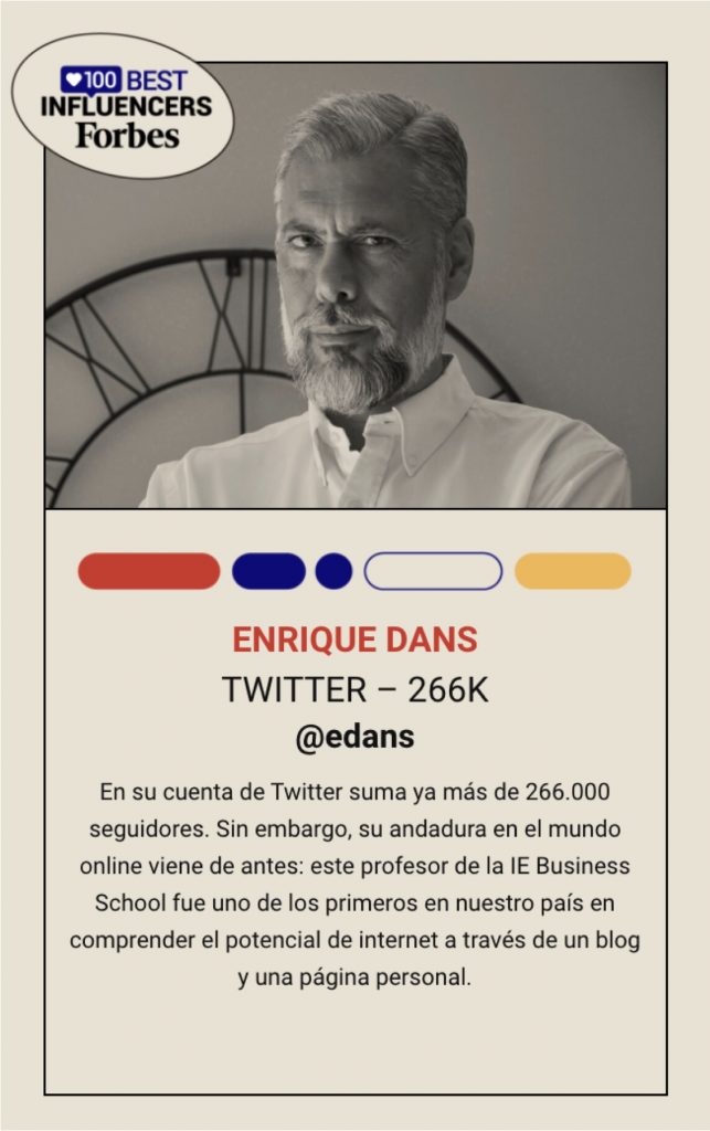 Forbes España ha tenido a bien incluirme en su lista de los 100 influencers, encuadrado en la categoría Business. Además, me pidieron un artículo sobre mi visión de la influencia y el fenómeno influencer como tal, que titulé «El ‘influencer’ y el diván del psicoanalista» (pdf), en el que trato de hacer un análisis de lo que suponen este tipo de figuras en el panorama comunicativo, de sus paralelismos con otras figuras dentro del entorno comunicativo, con las aproximaciones que las marcas hacen a ellos, o con la realidad – o en algunos casos, ficción – que aparece detrás de ellos.