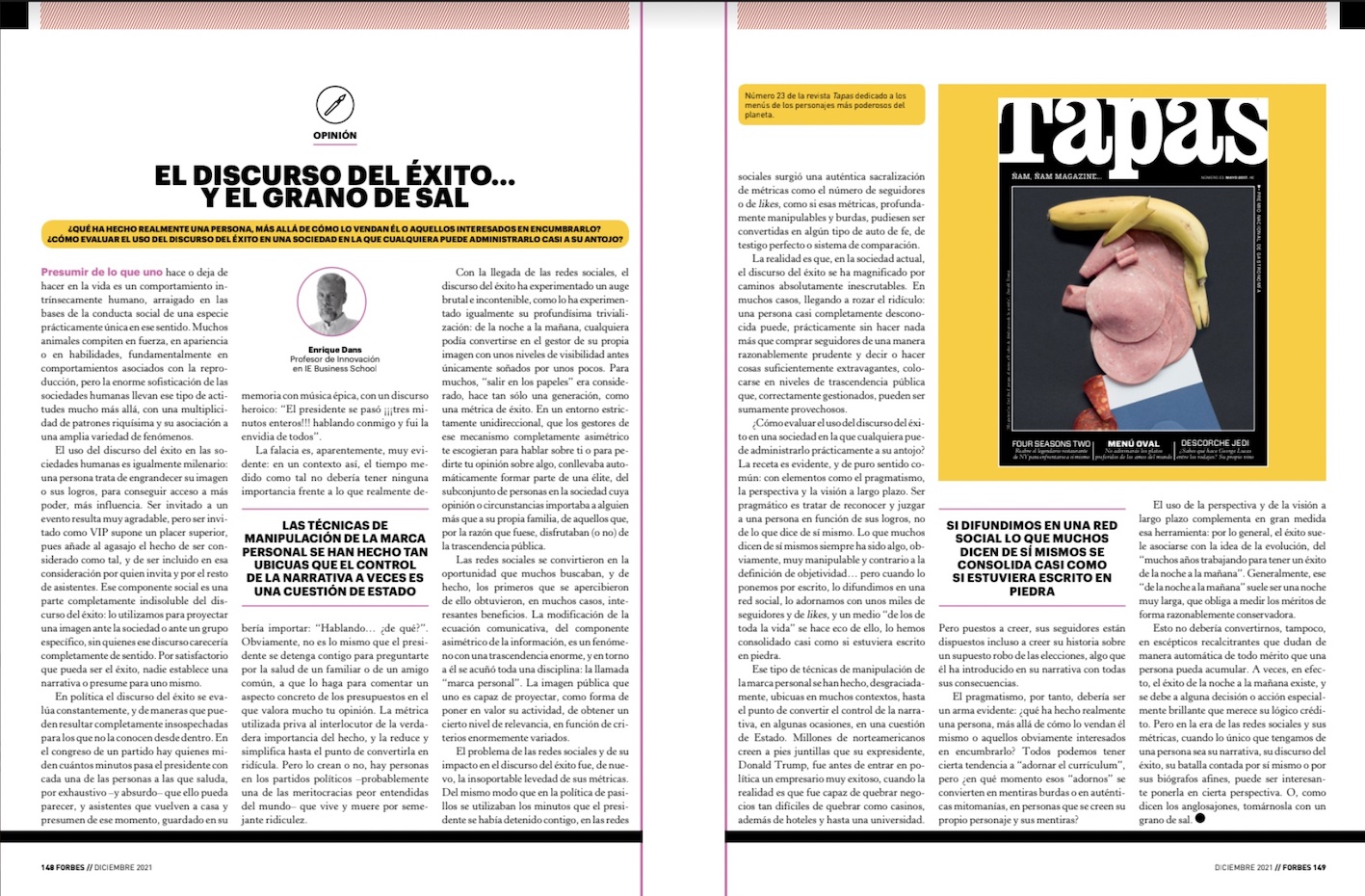Pablo Álvarez, de Forbes España, me pidió un artículo para la revista de diciembre sobre el discurso del éxito, sobre las claves de los discursos que hacen que nos creamos a los personajes que los formulan, pero sobre todo, saber identificar cuándo están vacíos, por qué funcionan y cuán extendidos están en la política y en la empresa.