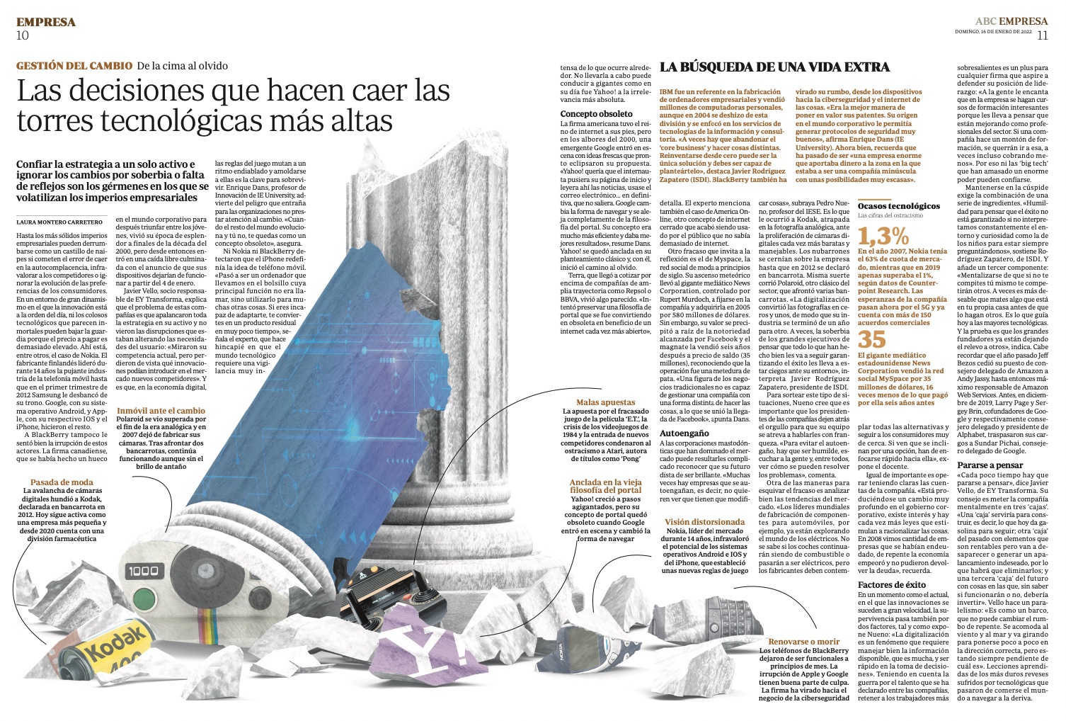 Laura Montero, de ABC, me llamó para hablar sobre compañías que en su momento lo fueron todo en el escenario tecnológico, pero que cayeron en desgracia por diversos factores y llegaron hasta convertirse en completamente irrelevantes o desaparecer. Hoy, en su artículo titulado «Las decisiones que hacen caer las torres tecnológicas más altas» (pdf), Laura cita algunos de mis comentarios.