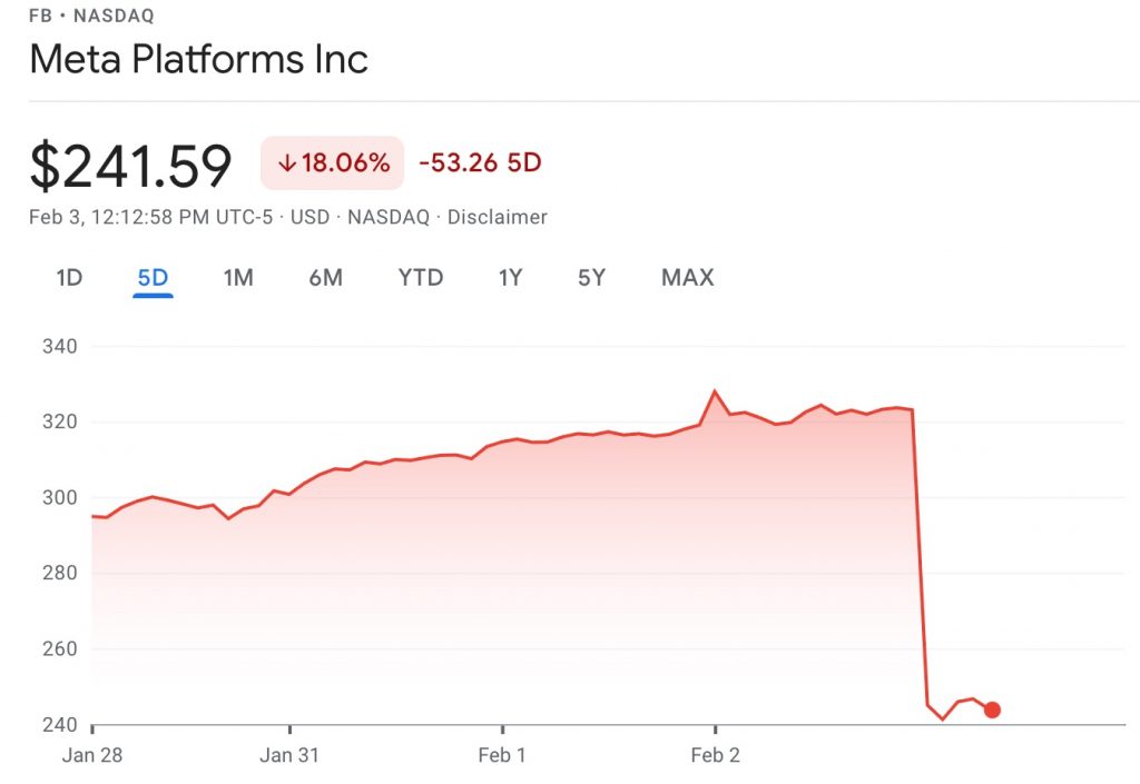 Las acciones de Meta muestran una brutal caída de más del 20%, que supone una pérdida de 240,000 millones de dólares en el valor de la compañía, a partir de la publicación de unos resultados algo más débiles de lo esperado, unas previsiones todavía más débiles, y unas declaraciones de Mark Zuckerberg en las que se muestra obviamente preocupado por la competencia: «las personas tienen ahora muchas opciones sobre cómo invertir su tiempo, y aplicaciones como TikTok están creciendo muy rápidamente”.