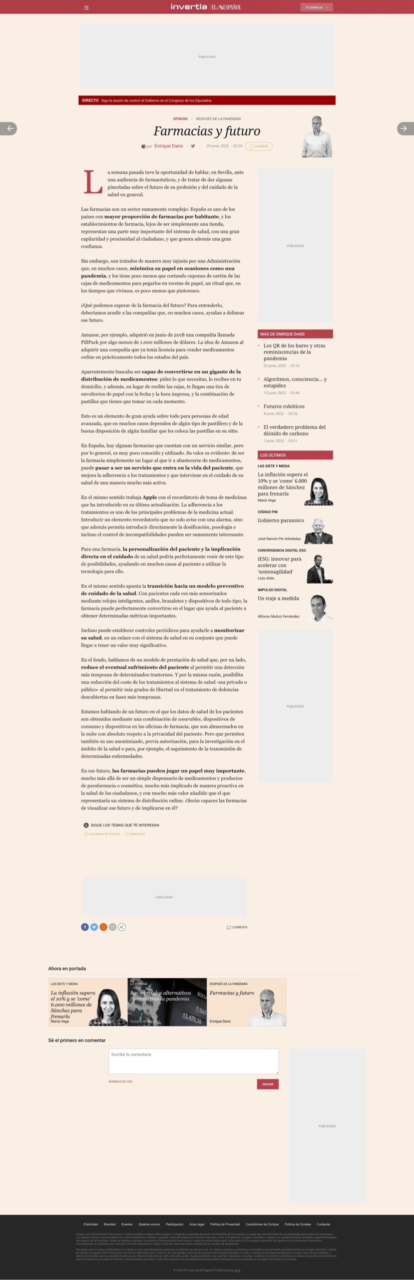 «Las farmacias están en un momento muy interesante: resignarse a un papel de canal de distribución de medicamentos que, más tarde o más temprano, sufrirá de forma creciente la competencia de la distribución online». E. Dans.