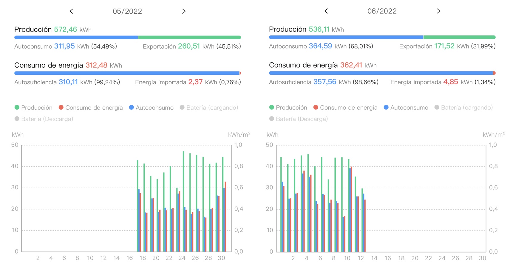 Por otra parte un consumo medio de unos 750 kWh al mes como el que indicas (si entiendo bien las gráficas) me parece bastante elevado para mayo/junio y un poco sorprendente, en mi caso está siendo por debajo de 300 kWh al mes para esos meses, aunque sin coche eléctrico.