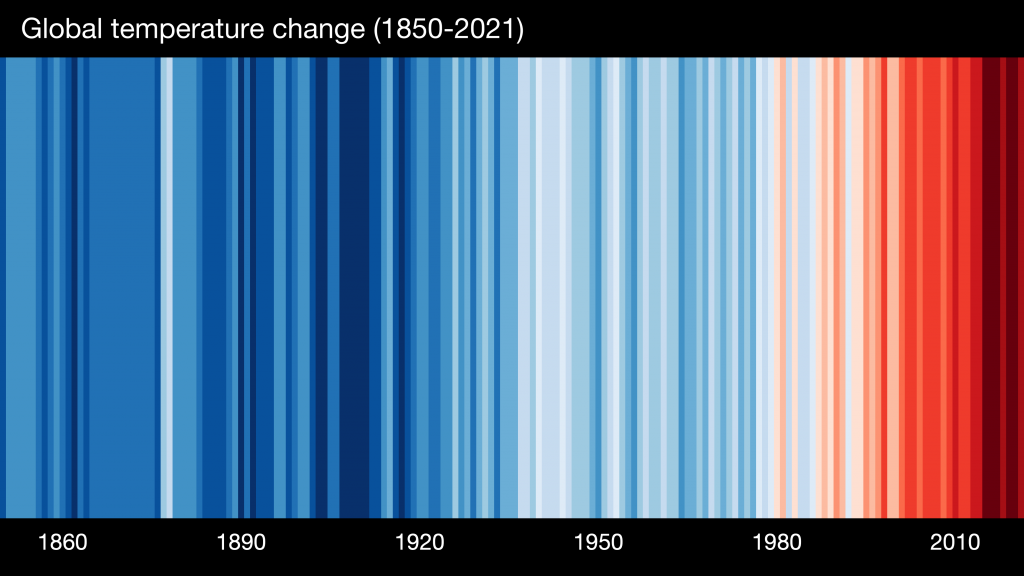 Recurro al conocido gráfico de barras de #ShowYourStripes creado por el climatólogo Ed Hawkins en la Universidad de Reading para ilustrar, en un día de ola de calor como hoy en España, el brutal incremento de la temperatura media a nivel mundial a lo largo de los últimos 170 años, resultado claro e inequívoco del desarrollo de una economía basada en el uso y abuso de los combustibles fósiles.