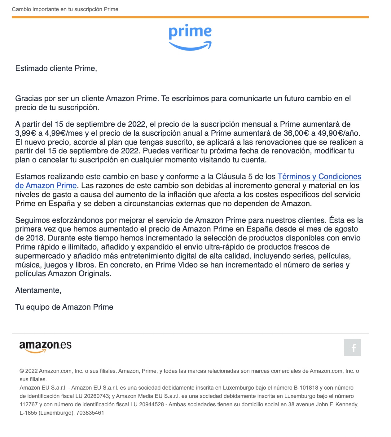Recibi el email de Amazon subiendo los precios y he decidido no renovar mi suscripción. Mis motivos son que el 90% de los pedidos que hago son encargos de amigos o familiares, que saben que tengo la cuenta Prime y me los piden a mi. Por otro lado, suelo usar Prime Video por comodidad, pero hay que decir que gran parte de su contenido es previo pago, por lo que tampoco veo el chollo por ningún lado. Y por último, argumentar que suben la tarifa debido a la inflación, se lo creerán otros, pero yo no me lo trago. Si eso fuera así, hubieran subido un 10% y no un 40%, como han hecho. Para terminar, sería recomendable para el usuario poder pagar conforme a los servicios que use. En mi caso, yo no utiizo Amazon Photos, Amazon Music, Amazon Drive ni Amazon pijos… Un saludo.
