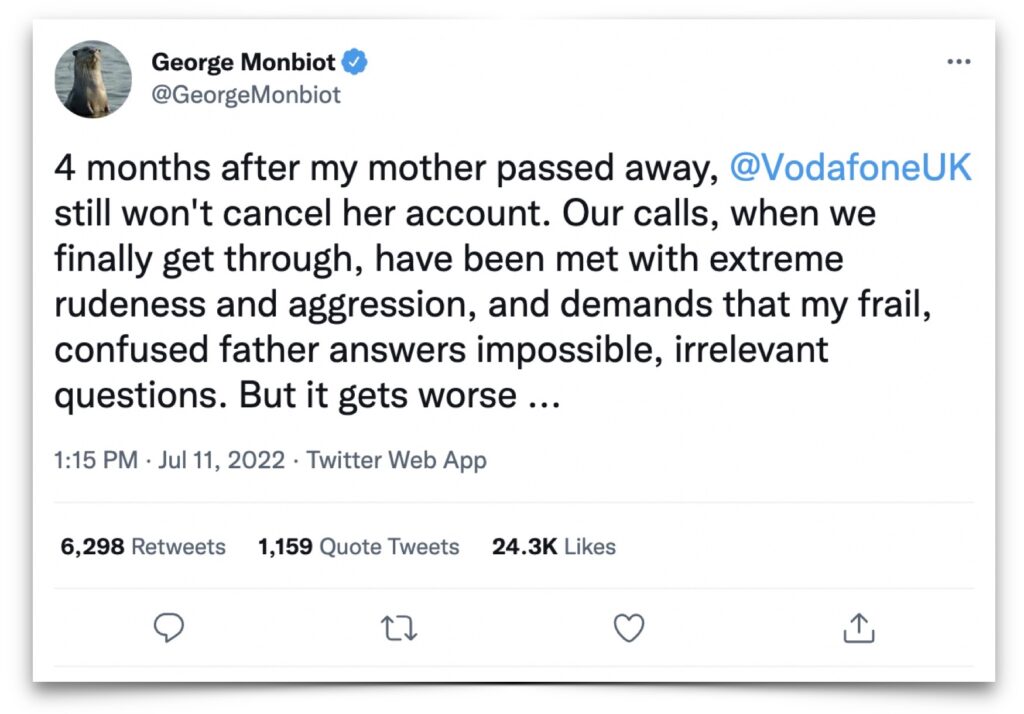 El prestigioso periodista y activista medioambiental británico George Monbiot, reciente ganador del Premio George Orwell, se encontró con una circunstancia especialmente desagradable a raíz del fallecimiento de su madre hace unos meses: cuando intentaron cancelar su contrato de telefonía móvil que tenía con Vodafone, la compañía comenzó a poner todo tipo de dificultades, a exigir hablar con su padre, muy mayor y confundido, y a demandarle datos como la fecha exacta en la que se había firmado el contrato, que obviamente no podía recordar.