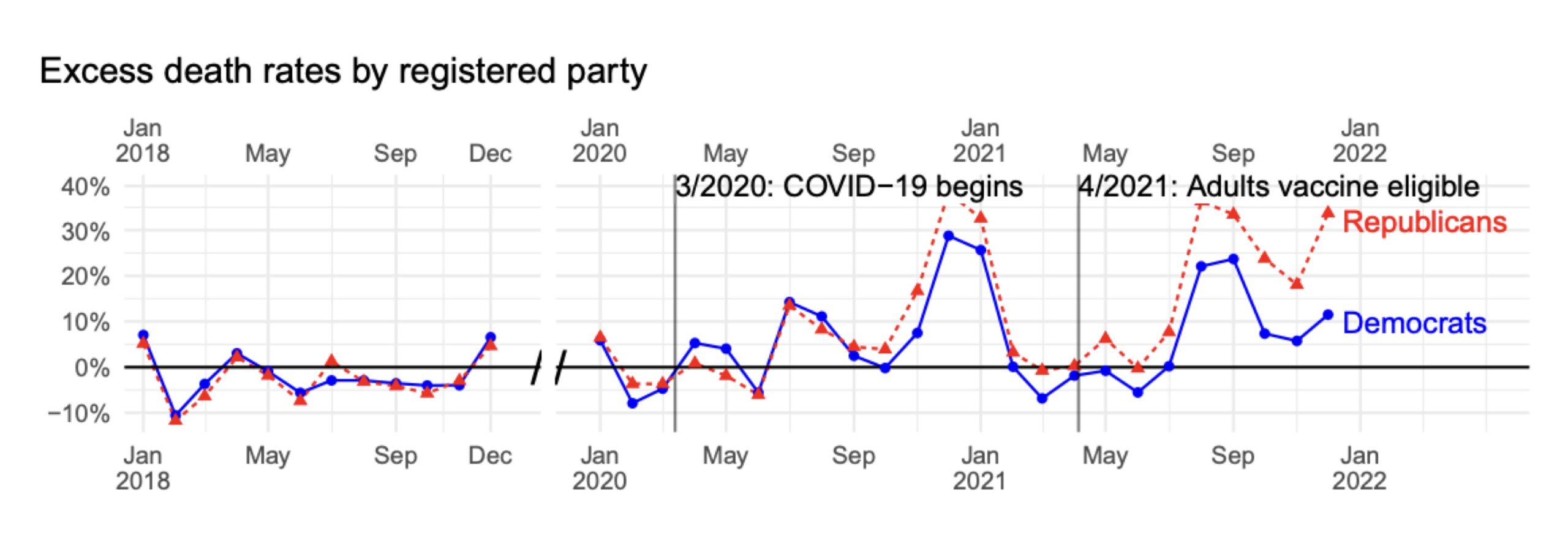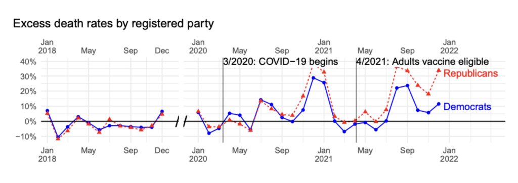 Un interesantísimo estudio llevado a cabo por tres profesores de Yale, Jacob Wallace, Paul Goldsmith-Pinkham y Jason L. Schwartz, titulado «Excess death rate for republicans and democrats during the COVID-19 pandemic«, y publicado por el prestigioso National Bureau of Economic Research (NBER), viene a probar, mediante el análisis de series temporales, la relación entre el exceso de mortalidad que tuvo lugar durante la pandemia de COVID-19 y la afiliación política de las víctimas, recogida en sus registros de votación.